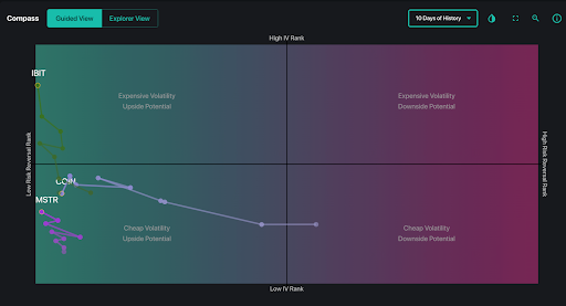 Comparisons with COIN and MSTR reveal the same pattern: elevated implied volatility across Bitcoin proxies makes it expensive for traders trying to position for a bounce.