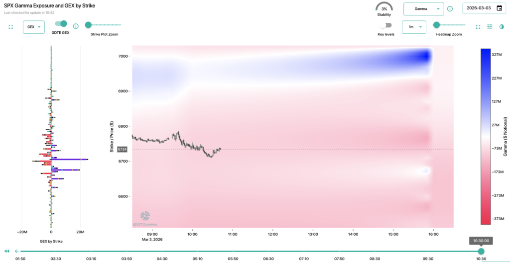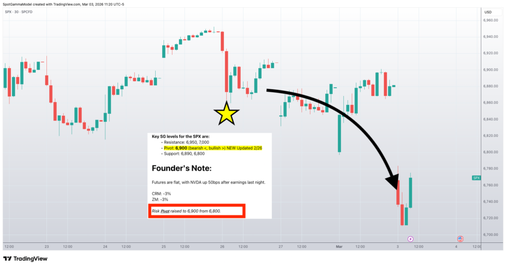 On February 26th, 2026 SpotGamma Founder, Brent Kochuba, raised the SPX Risk Pivot to 6,900 from 6,800 due to the dynamics of negative gamma building below SPX price.