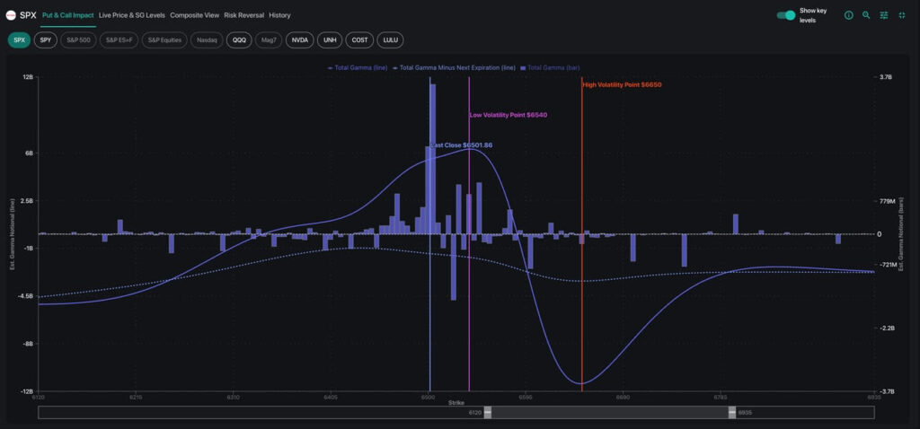 While the S&P 500 remains in highly positive dealer gamma, this exposure is somewhat unstable given the narrow range around current price levels (6,450-6,550), meaning any significant move in either direction could quickly erode dealer hedges and accelerate price action.