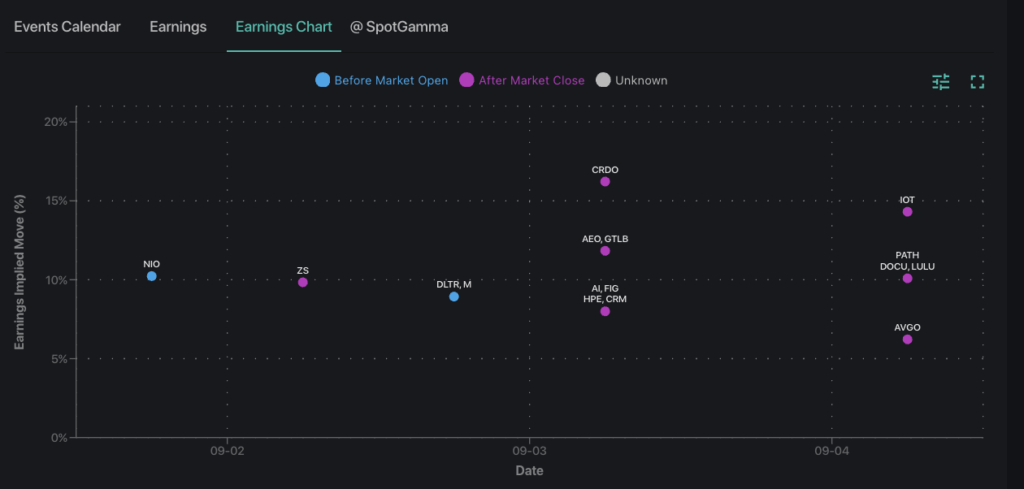 The upcoming week features a holiday-shortened schedule with markets closed Monday for Labor Day, followed by important earnings from Salesforce (CRM) and American Eagle (AEO) on Wednesday, then Broadcom (AVGO) and Lululemon (LULU) on Thursday. Friday’s Non-Farm Payrolls report serves as the week’s primary macro catalyst.