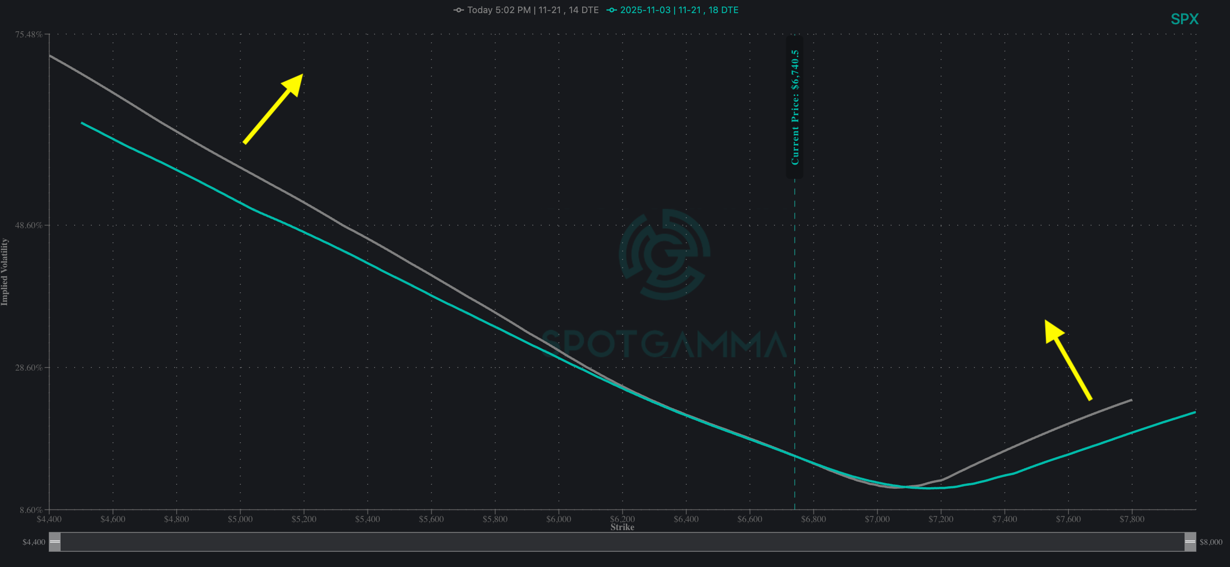 The critical question remains: Will traders take profits at current price levels and grab downside protection, which could exacerbate the move below the 6,500 – 6,600 range through dealer hedging flows? Or, will vol sellers step up once again to sell higher premium puts, pushing IV down and helping the market glide to 7,000?