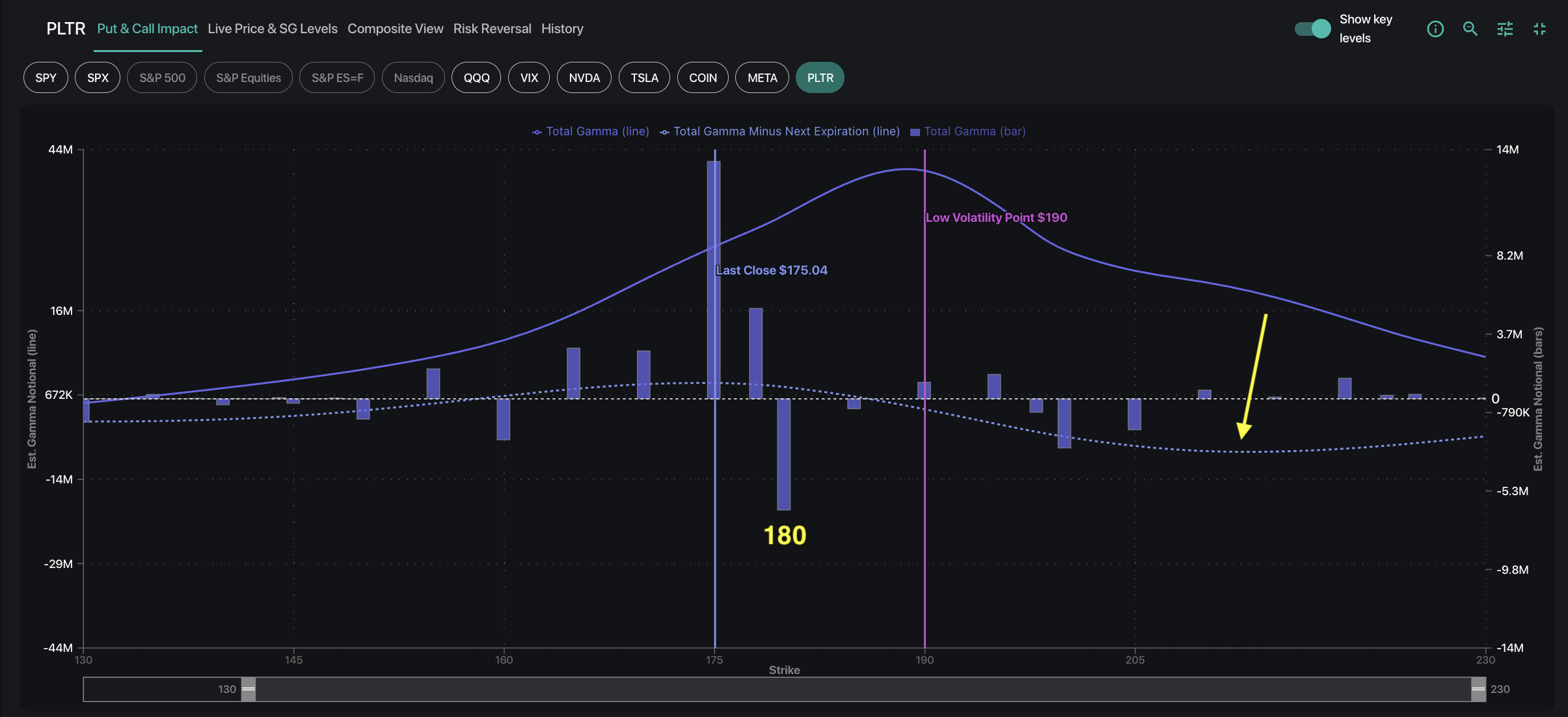 While this may indicate weakness in the evolving AI and tech narrative, the options market paints another interesting picture. Strong positive gamma at the 170 strike provides support for PLTR, while pronounced negative gamma at 180 may be important to monitor as an acceleration point.
