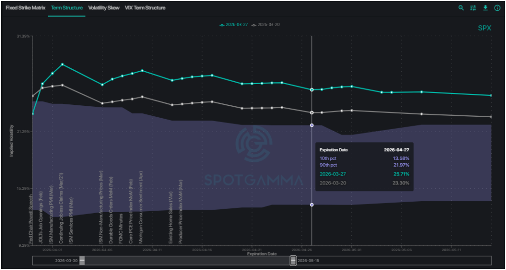 - Index options trading at extreme IVs (with implied volatility increasing week-over-week, as shown in the Term Structure chart below)