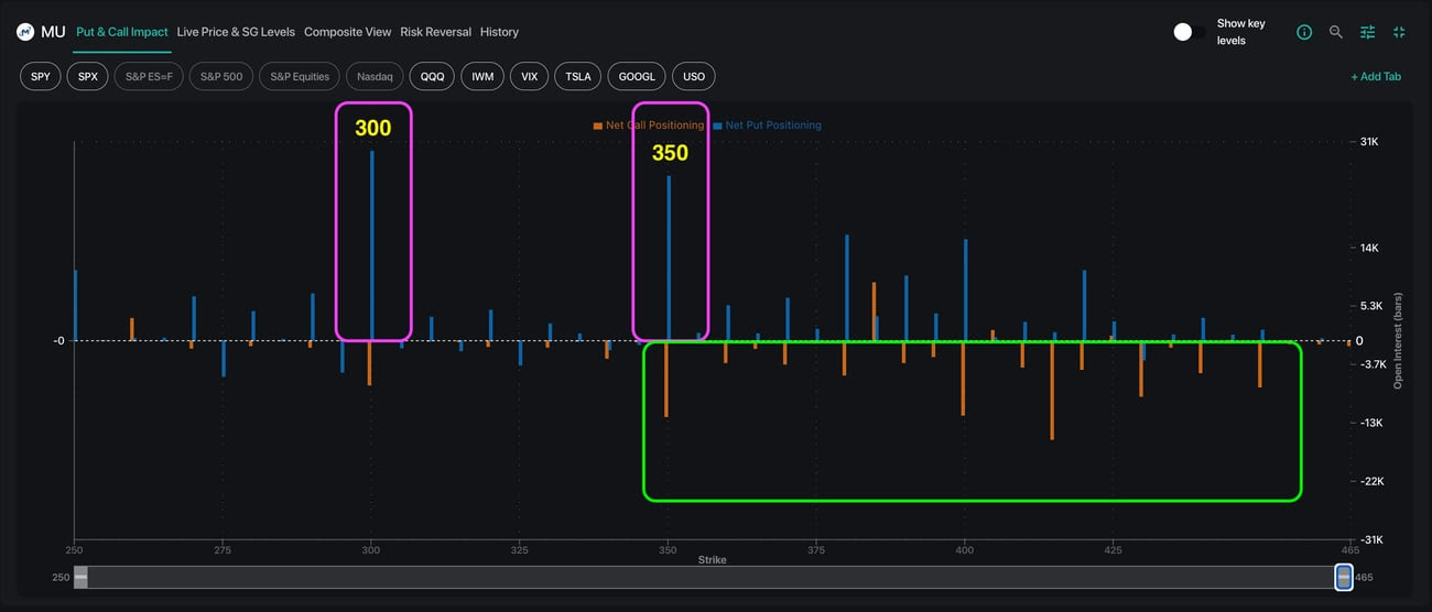 That said, select opportunities are still emerging. Micron (MU) fell 16% last week to 2-month lows at 357 as memory and semiconductor names experienced sharp drawdowns. However, our Synthetic OI model highlights concentrated short put positioning from traders: approximately 25k contracts at the 350 strike, and an additional 29k at the 300 strike.