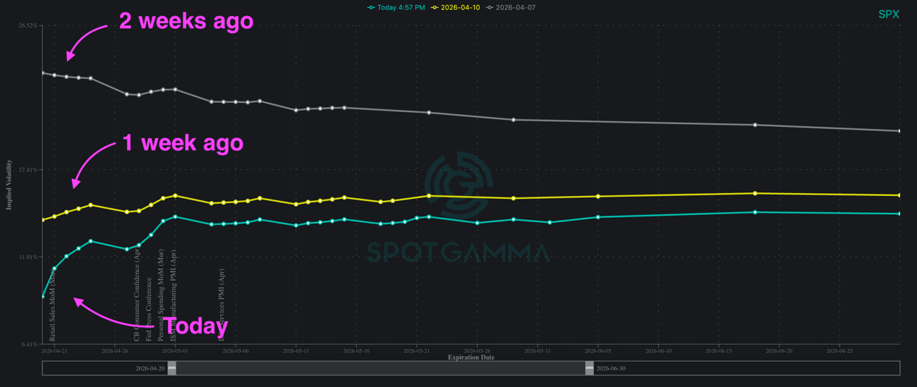 As a feature of last week’s rally, the SPX Term Structure has compressed dramatically across virtually every expiration. Currently, at-the-money IV for contracts expiring May 22 sits at ~14%. However, 1-month realized volatility is closer to 19%.