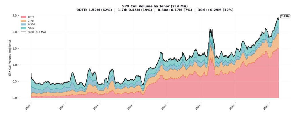 With the S&P 500 heavily lopsided towards call-buying, the trader-dealer dynamic matters considerably. When traders buy calls, the dealers who sell those calls need to buy futures to remain delta-neutral. As the market rallies, the value of those calls increases, and dealers must buy additional futures to hedge. This creates a self-reinforcing feedback loop that provides sustained bids to the market.