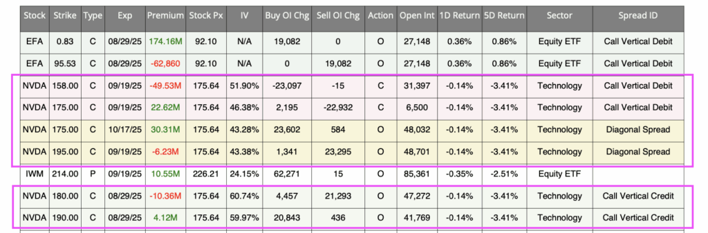 Analysis from SpotGamma’s FlowPatrol report reveals institutional positioning that reflects optimism-with-caution. Buy-side funds appear defensively positioned, utilizing complex spread structures rather than outright bullish bets.