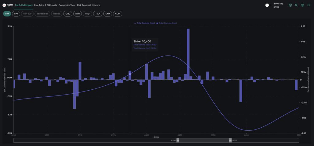 This rally was clearly amplified by options positioning: dealers who had been forced to sell into weakness from negative gamma below 6,400 suddenly found themselves buying back those same hedges as the market reclaimed positive gamma territory.