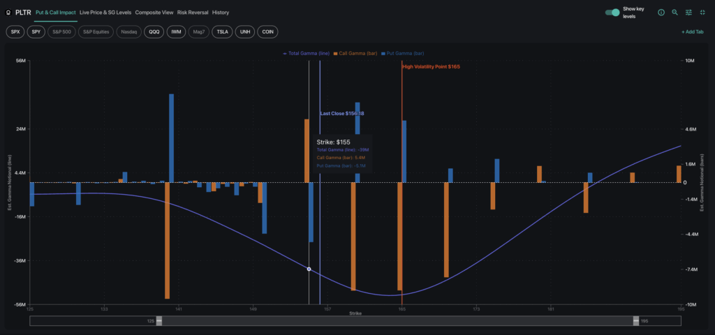By mid-week, PLTR showed a pronounced negative gamma profile as the stock tumbled over 16% from Monday to Wednesday morning. The negative gamma concentration became less severe near the major 140 strike, where the stock found support during Wednesday’s sell-off.