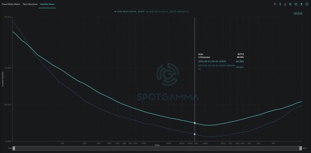 However, NVDA’s volatility skew tells a more defensive story: with 25-delta puts trading at significantly higher implied volatility than equivalent calls, traders are paying much greater premium for downside protection ahead of earnings.