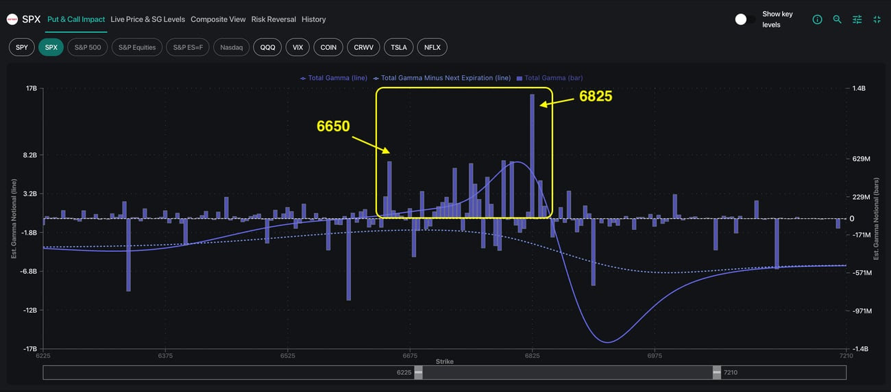 Markets experienced a dramatic arc last week as SPX bounced between key gamma levels at 6,650 and 6,800, ultimately closing Friday at 6,792. The S&P 500 gained a solid 1.5% for the week.