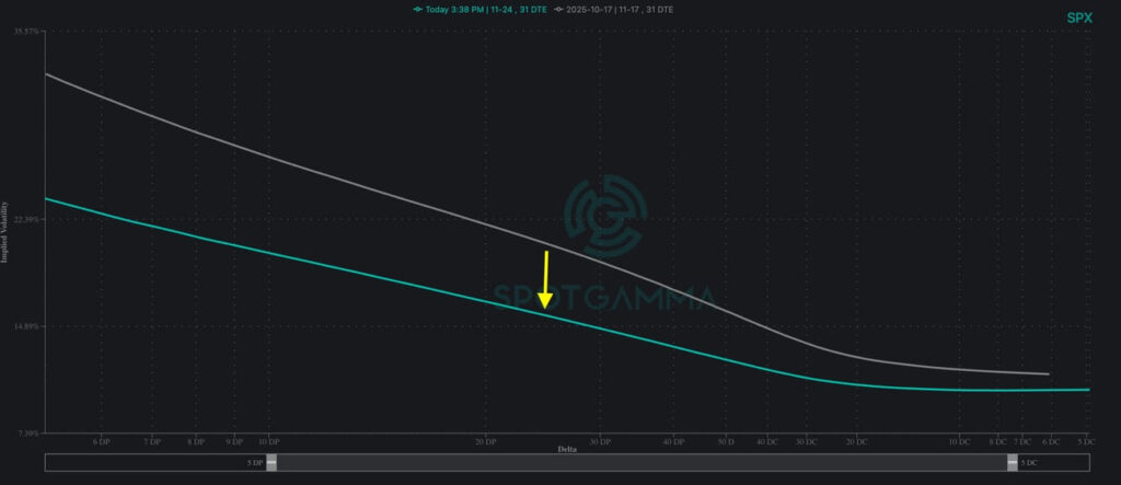 VIX expiration on October 22 created some volatility as positioning shifted for dealers. The “max pain” scenario played out nearly perfectly, with VIX pinning around the 18 strike — which held the largest amount of open interest — near expiry.