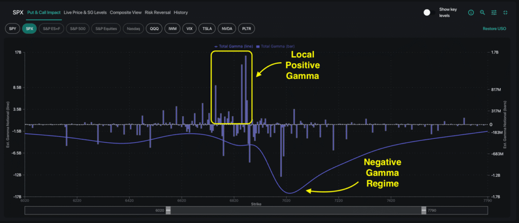 Should implied volatility re-expand — triggered by renewed macro stress, a geopolitical flare-up, or a disappointing economic event — those same dealer hedging flows hold the potential to reverse rapidly. In a negative gamma environment, those reversals can accelerate with intensity.