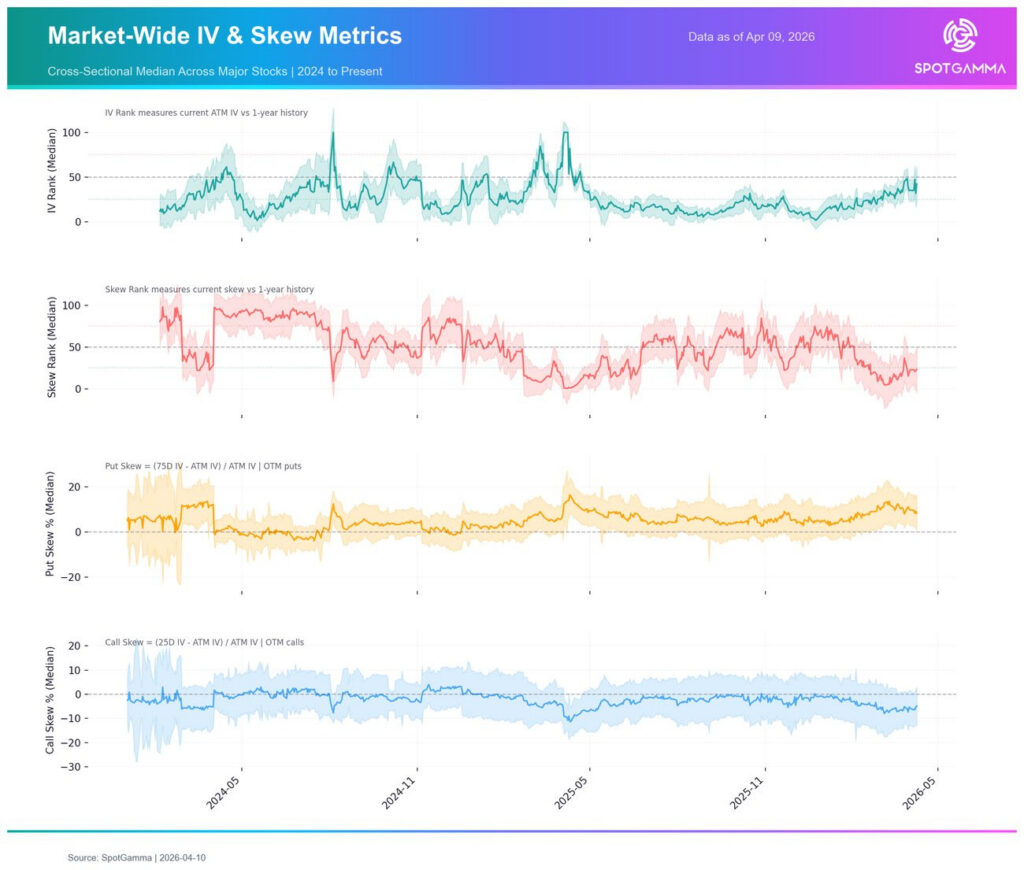 Meanwhile, longer-dated positioning remains defensive. A Skew Rank below 50% (second red line below) indicates puts are still expensive relative to calls, reflecting persistent demand for hedges. This suggests market participants are not yet fully convinced of the rally’s staying power.