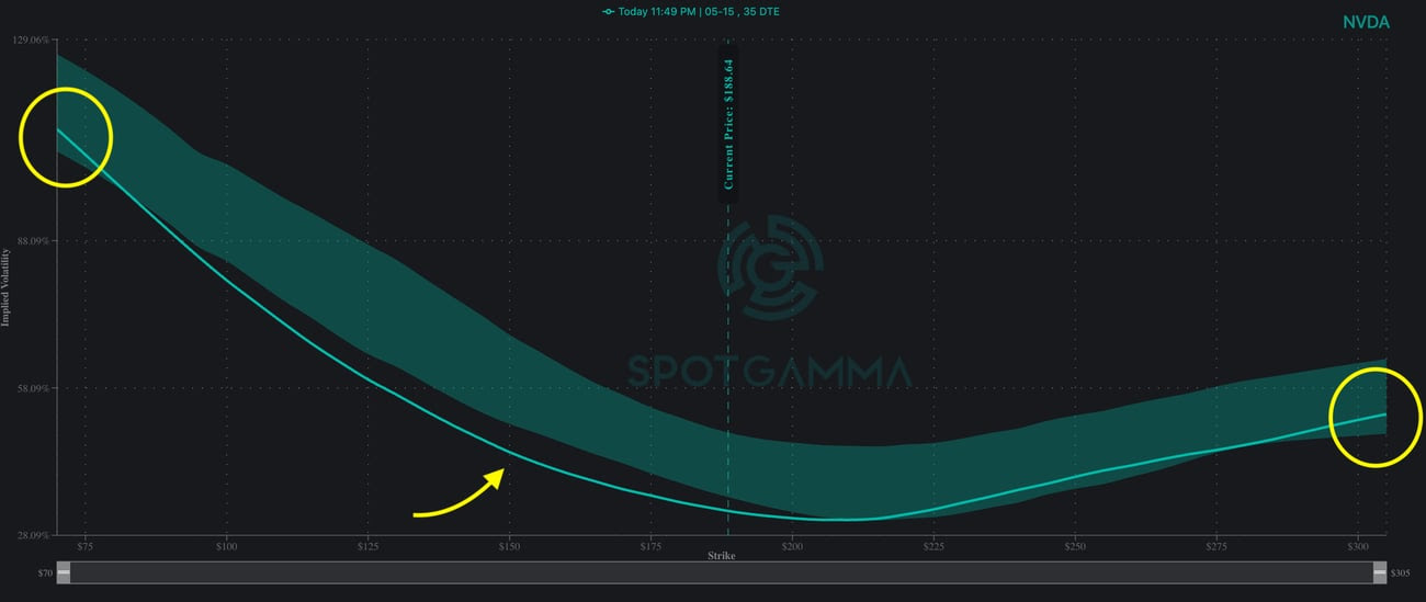 Take NVDA as a prime example: the current implied volatility (teal line) is still relatively low compared to the 60-day range (shaded area). IV is most notably compressed around the 150 strike, meaning options prices are significantly lower here compared to the last two months.
